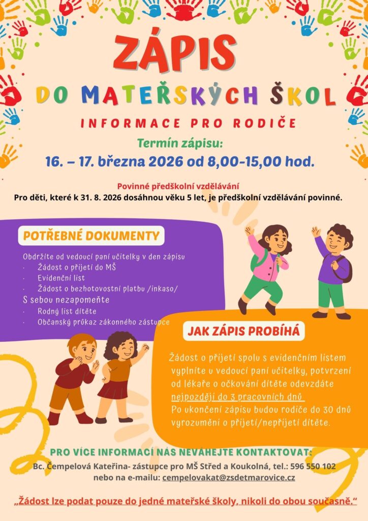 Zápis do mateřských školek - MŠ střed a MŠ Koukolná