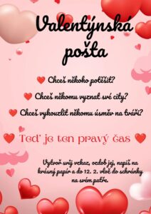Žákovská rada letos opět připravila tradiční Valentýnskou poštu, která přinese do školních chodeb trochu radosti a milých slov. Od pondělí mohou žáci i učitelé vhazovat svá přáníčka do označené valentýnské schránky. Členové Žákovské rady pak všechna přání roztřídí a den před svátkem svatého Valentýna je osobně doručí adresátům.